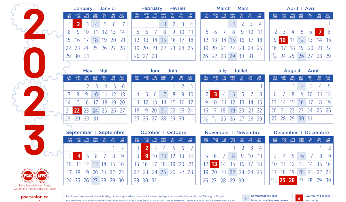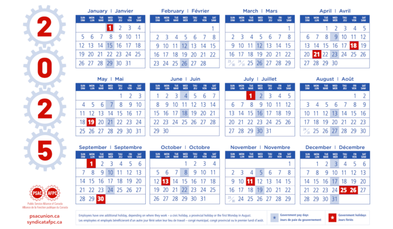 L’Alliance de la Fonction publique du Canada (AFPC) est l’un des syndicats les plus importants au Canada. Et chaque année, il publie son calendrier 2025 fonction publique. Cela à destination des plus de 170 000 travailleuses et travailleurs qu’il représente partout au Canada. Avec une sur représentation au Québec, 40 000 fonctionnaires.